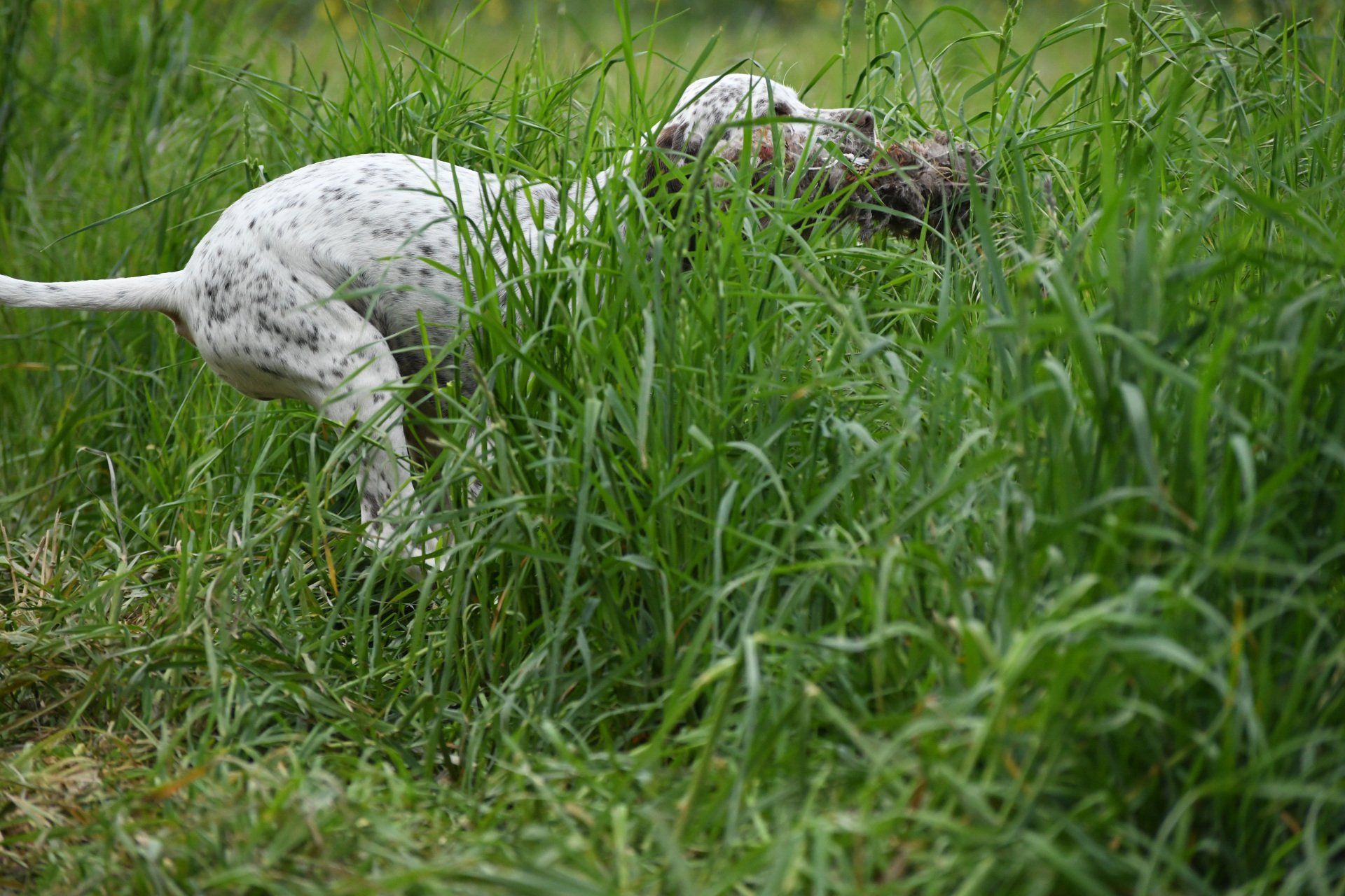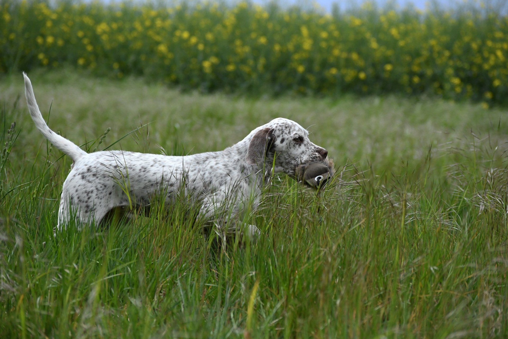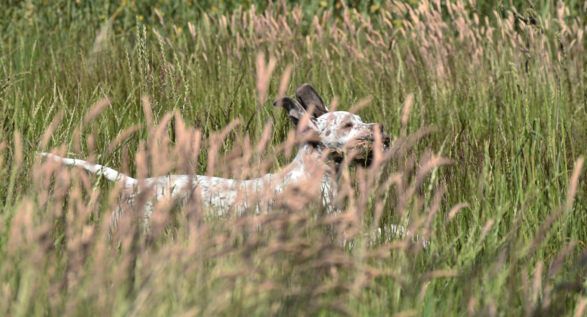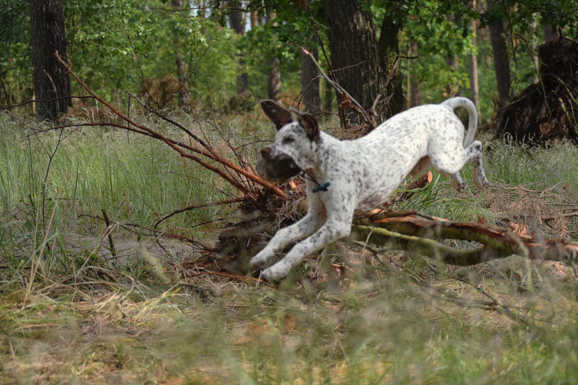 Felicia sitzt steady - ich laufe weg von ihr und werfe das Dummy , dann zurück zu Felicia und weise sie in die Suche ein. Sie läuft gerade aus , zeigt dann eine sehr gute Suchenleistung mit hoher Nase, nimmt das Dummy sofort auf, kommt direkt und zügig zurück und apportiert in die Hand.