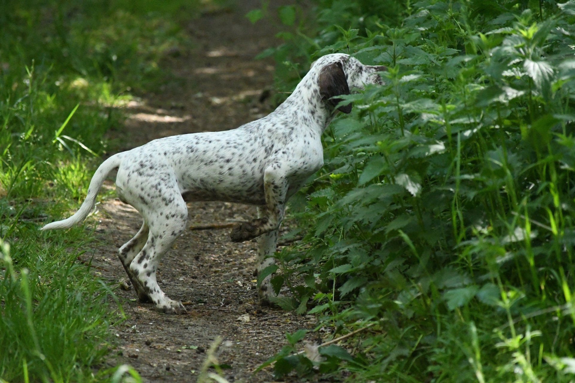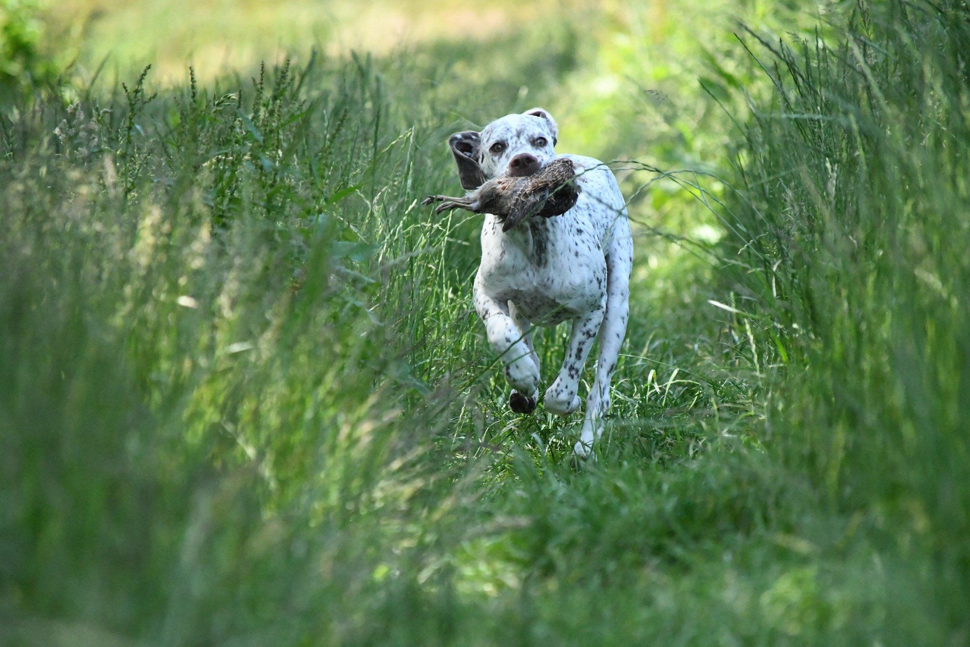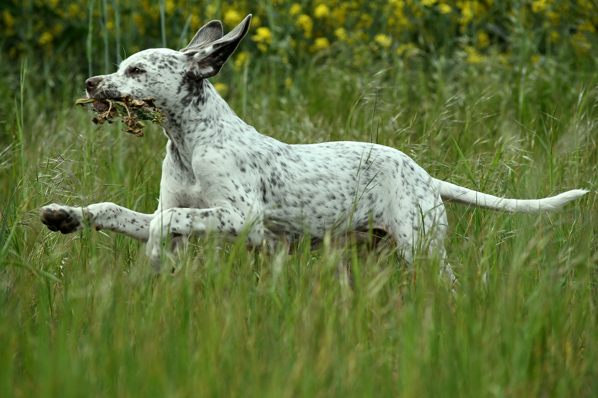 Felicia sitzt steady - ich laufe weg von ihr und werfe das Dummy , dann zurück zu Felicia und weise sie in die Suche ein. Sie läuft gerade aus , zeigt dann eine sehr gute Suchenleistung mit hoher Nase, nimmt das Dummy sofort auf, kommt direkt und zügig zurück und apportiert in die Hand.