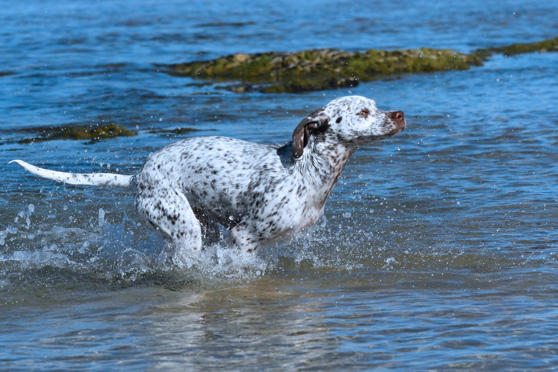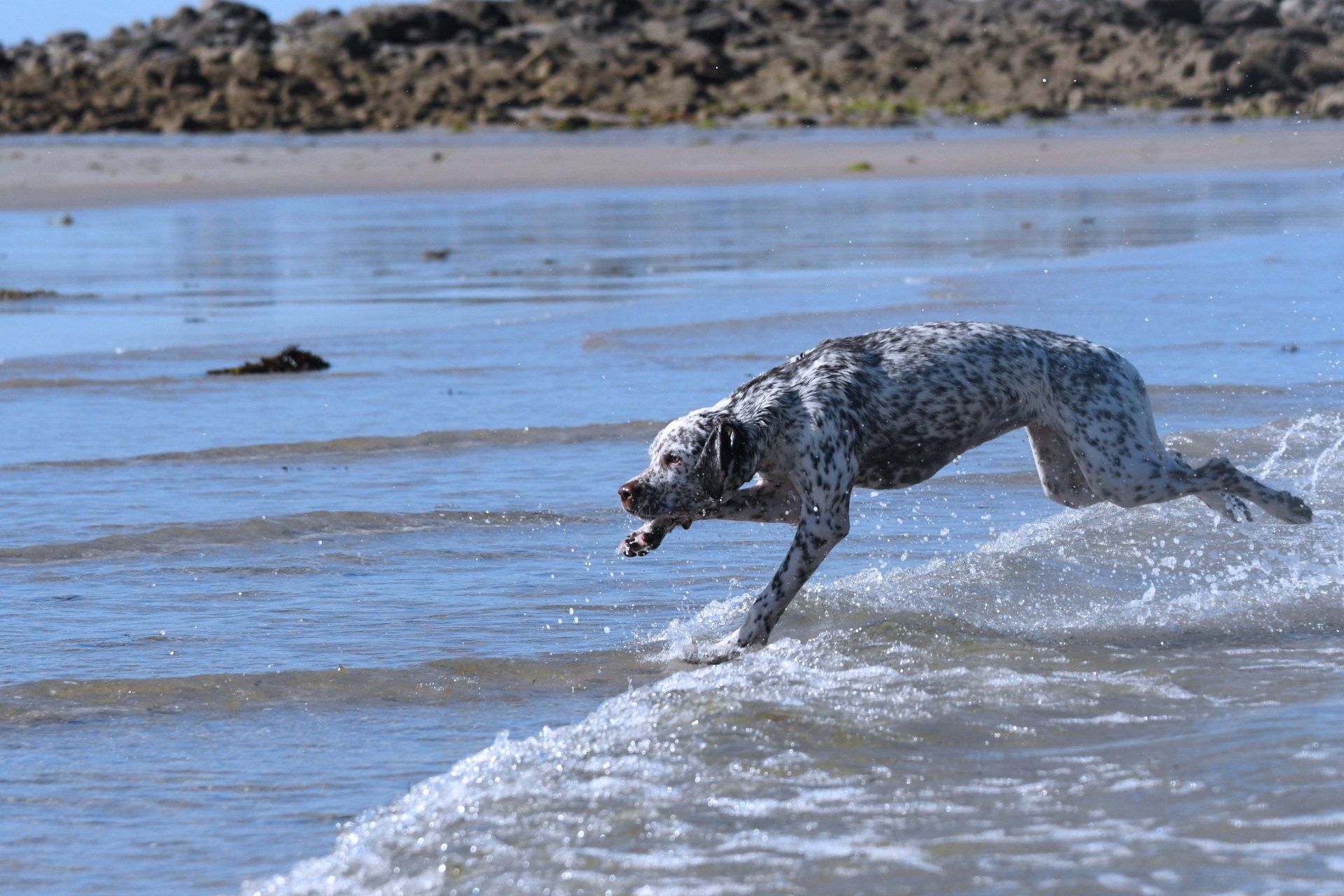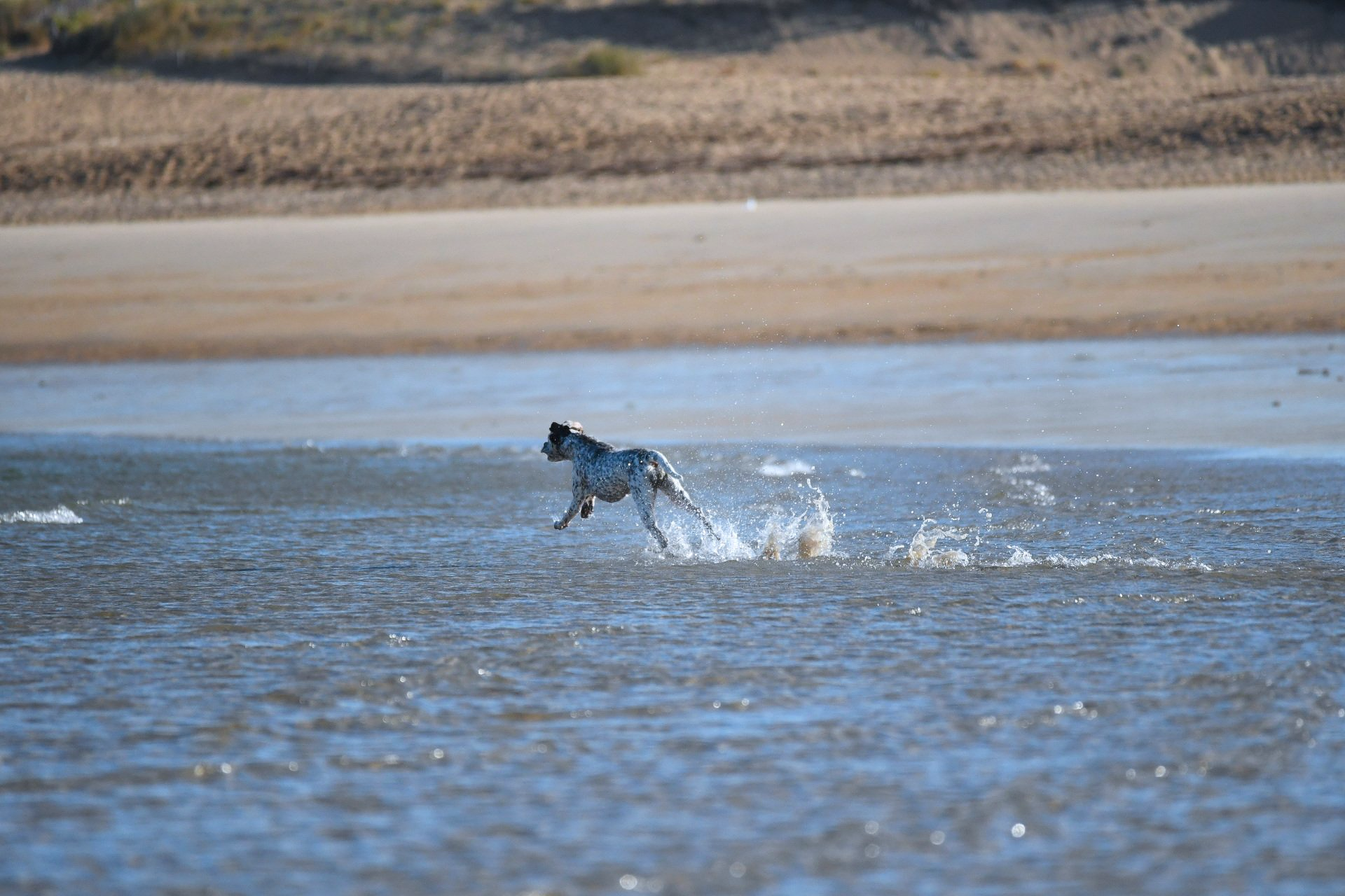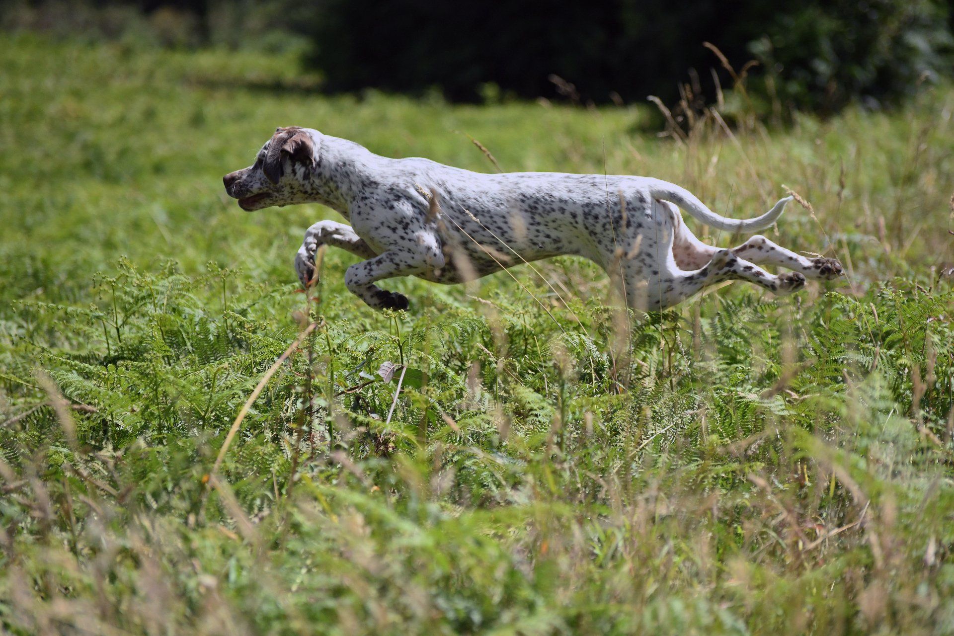 Felicia sitzt steady - ich laufe weg von ihr und werfe das Dummy , dann zurück zu Felicia und weise sie in die Suche ein. Sie läuft gerade aus , zeigt dann eine sehr gute Suchenleistung mit hoher Nase, nimmt das Dummy sofort auf, kommt direkt und zügig zurück und apportiert in die Hand.