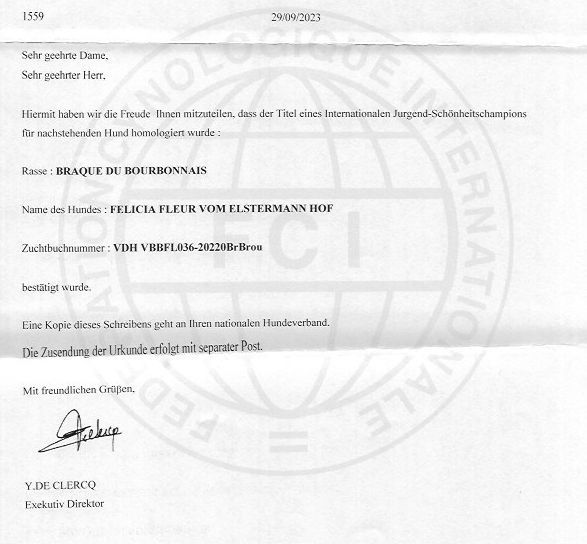 The dam of the litter will be C.I.B.J. VDH European Winner 24, German Winner 24, VDH European Youth Winner 23, German-J-Winner 23, and Agria Junior Winner 23. Felicia Fleur vom Elstermann Hof. The sire of the litter will be Tokyo du Bois de la Hulotte. Tokyo is the same age as Felicia and is a very harmoniously built, typical standard-sized male with a balanced temperament. He has perfect hips (A/A) and is a Trialer, DNA-tested, CAC(S) FTGT EXC CACT. Furthermore, he just won the working dog class at the Nationale D'Elevage Braque du Bourbonnais with an excellent 1 CAC, and his son was "Best of Breed" at the largest Braque du Bourbonnais breed show in France, with 49 entries.