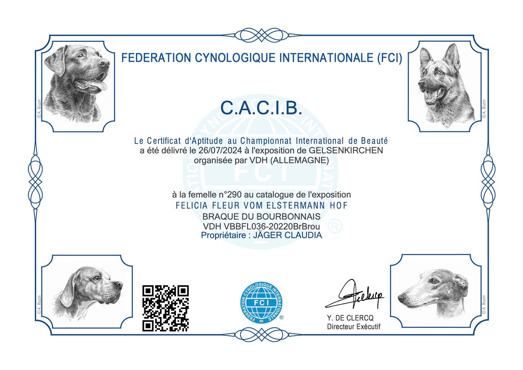 Auf der Durchreise erhielt Felicia auf der schönen Outdoor Show des VDH den Titel GERMAN WINNER 2024, V1, BEST OF BREED, FCI-CACIB, Anw. Dt.Ch. VDH (2x), CAC Neutral. Gerichtet hat der internationale Zuchtrichter Willi Güllix (De). Wir freuen uns sehr über die Auszeichnung!